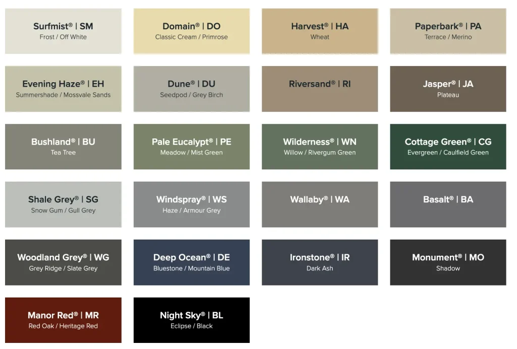 Below is a colour chart showcasing the most popular shades. For the full selection, download the official Colourbond colour chart.